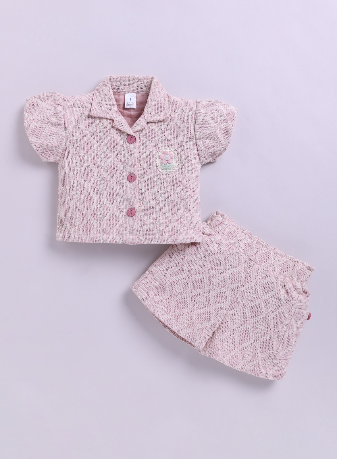 This clothing set consists of Pink printed Top with short sleeves and Pink printed Shorts for girls