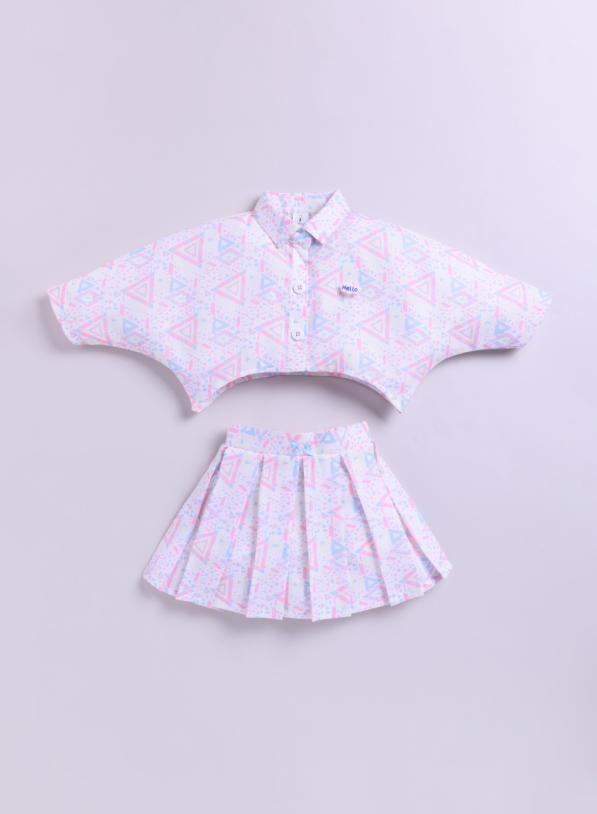 This clothing set consists of a Pink and Blue printed White Top with short sleeves and Pink and Blue printed White skirt for girls